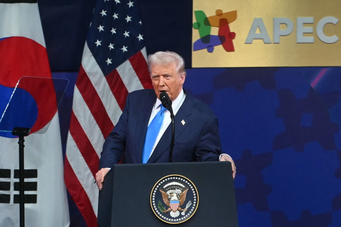 US President Donald Trump speaks at the APEC CEO Summit in Gyeongju, South Korea on Oct. 29, 2025 (Courtesy of AFP via Yonhap)