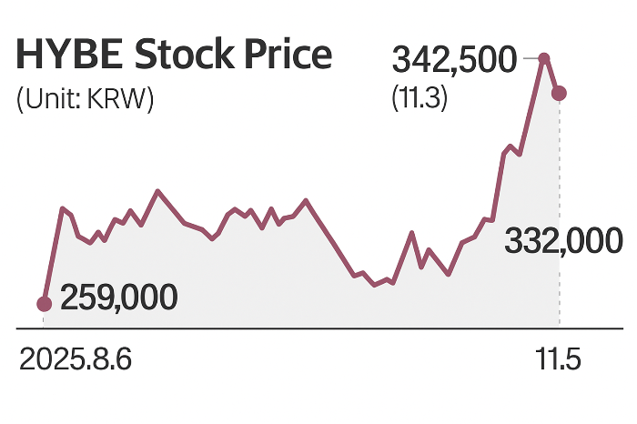 According to the Korea Exchange on Wednesday, HYBE closed at 332,000 won (about $240), down 2.64% from the previous session but still up 23.9% from early October when it traded at 268,000 won. The surge stands in sharp contrast to declines of more than 10% each at rivals YG Entertainment and SM Entertainment over the same period.