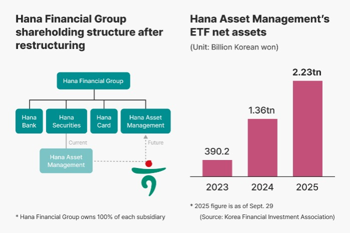 With Hana Asset as a direct subsidiary, Hana Financial is expected to invest more aggressively in the firm’s retirement and ETF businesses.