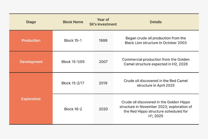 SK Earthon holds a 25% stake in the four oil development and exploration blocks, including its flagship Block 15-1 already in oil production.