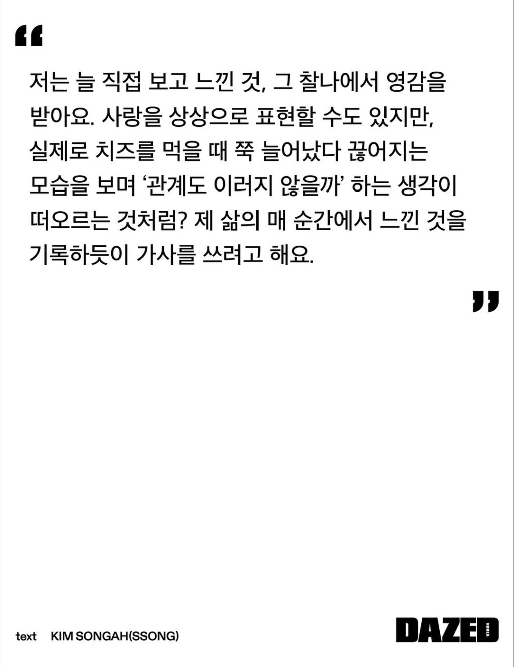 “I always get inspiration from what I saw and felt. You can express love by imagination, but when you actually eat cheese, when you see how it grows and cut off, it reminds me of the thought of ‘Isn’t the relationship like this’? I’m going to write lyrics as if I’m recording what I felt in every moment of my life”