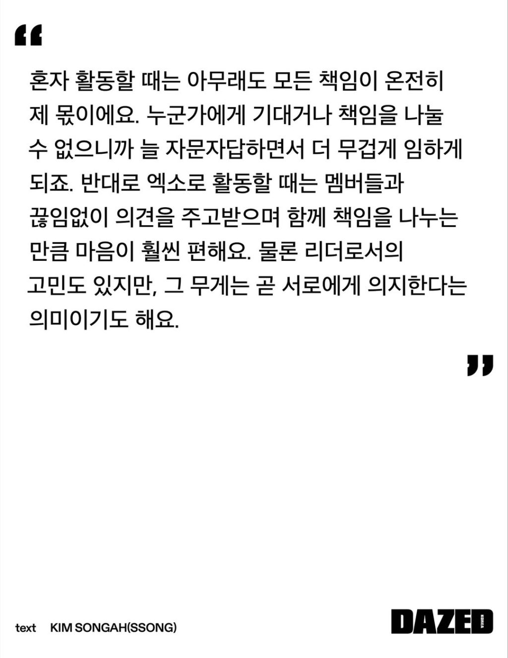 “When I am working alone, I’m completely responsible for everything. I can’t lean on someone or share the responsibility, so I will always answer questions and work harder. On the other hand, when I’m active as an EXO, I feel much more comfortable because I constantly exchange opinions with the members and share the responsibilities together. Of course, there are worries as a leader, but the weight also means that we rely on each other